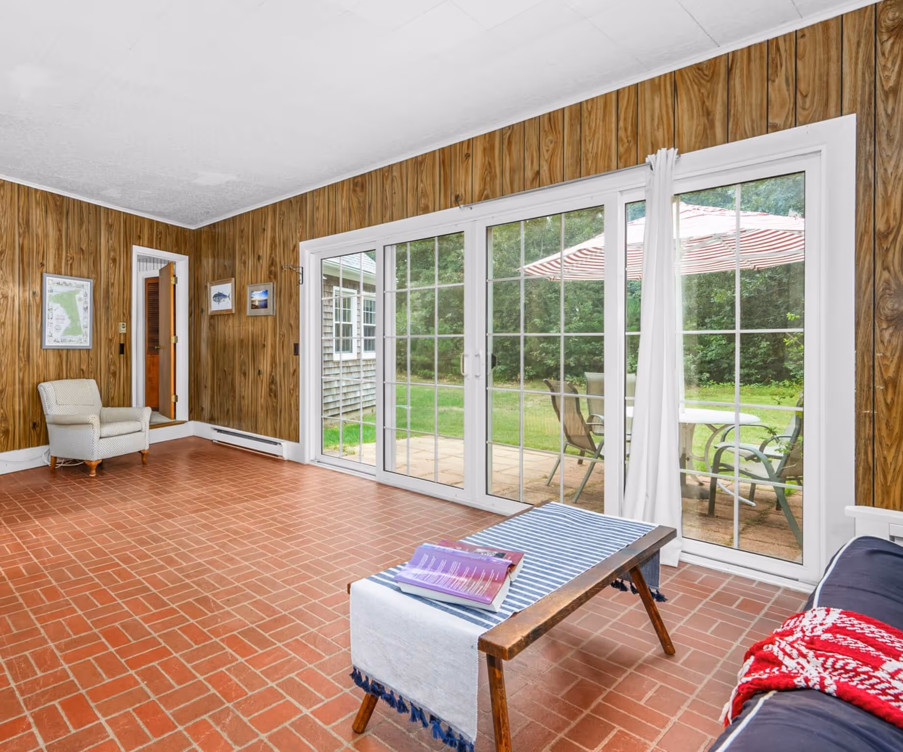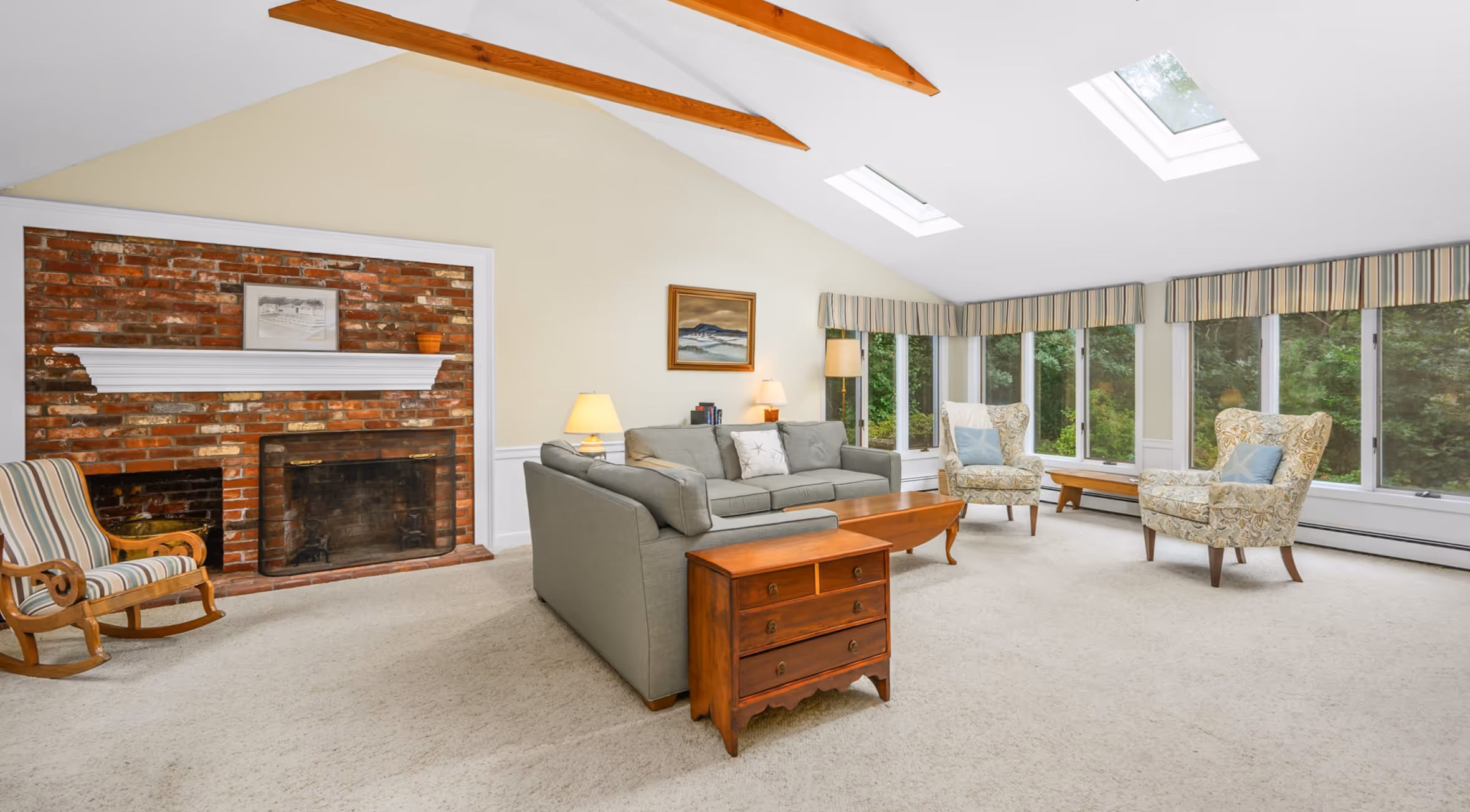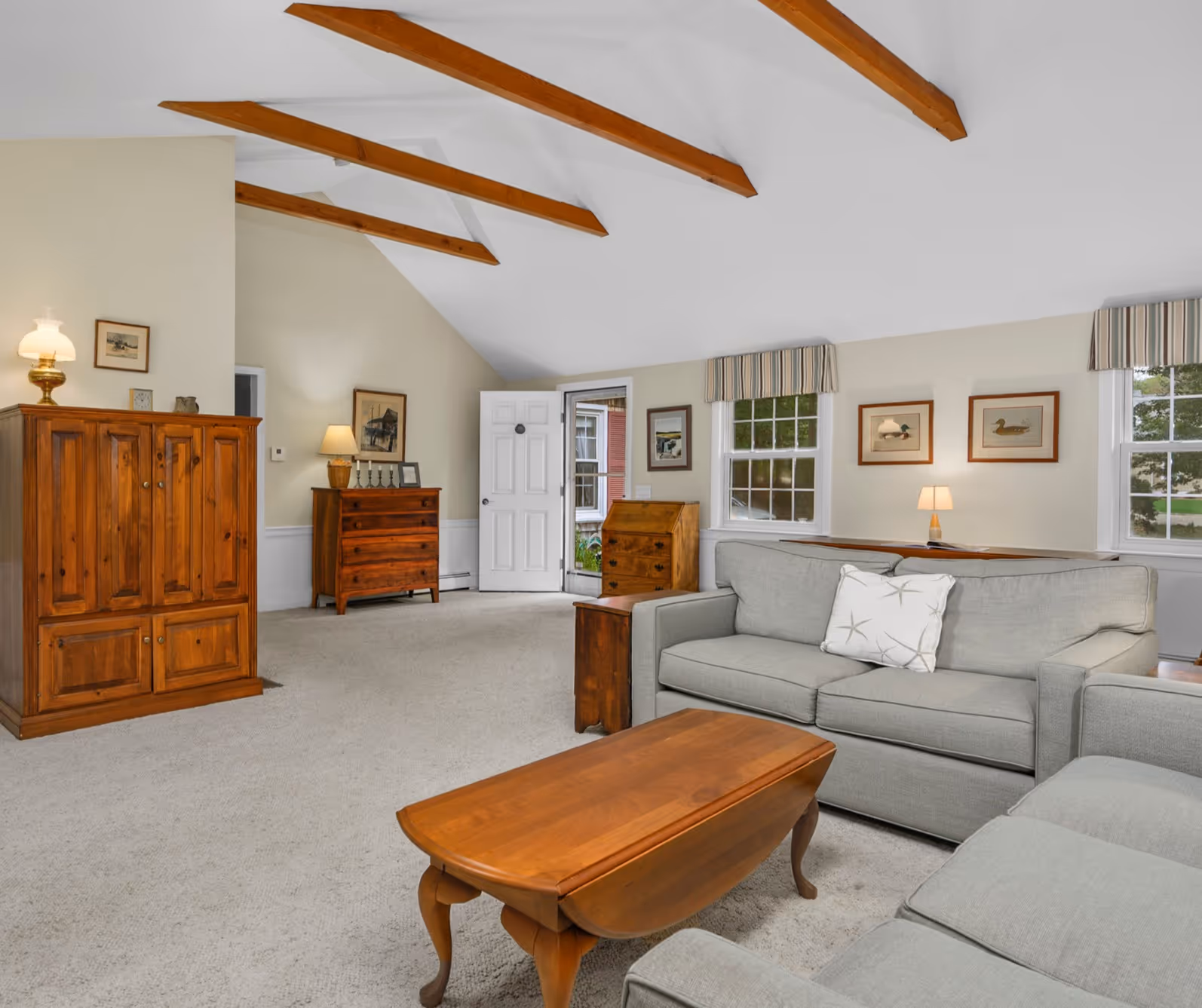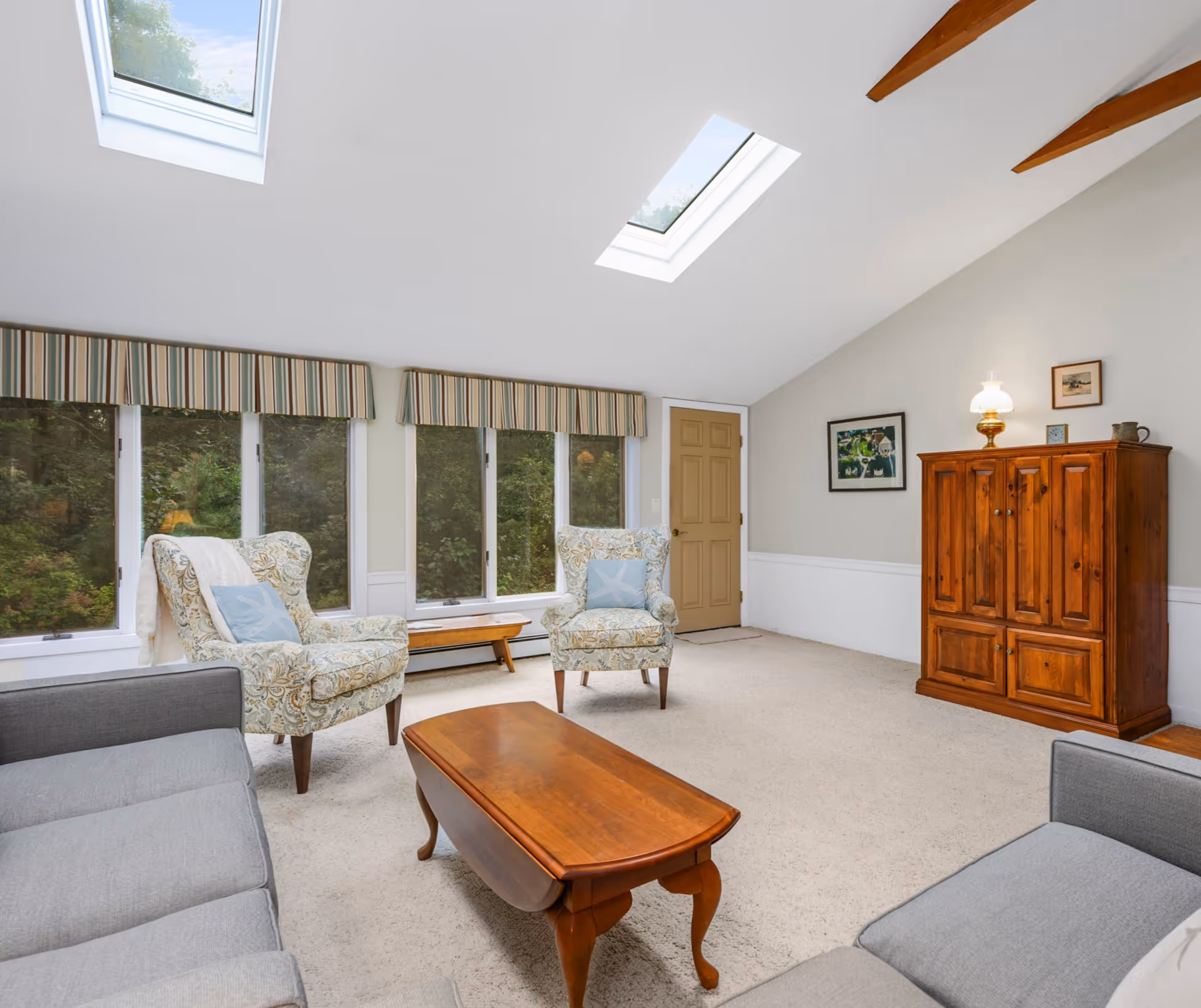 The living room is anchored by a classic brick fireplace and opens beneath a cathedral ceiling with exposed beams and skylights, creating a warm, expansive central space. Light pours in throughout the day, giving the room a bright, natural energy, while the fireplace becomes a cozy focal point in the evenings. Whether it’s coffee in the morning or quiet time after a beach day, this is the kind of room that defines Cape living—timeless, relaxed, and full of character.