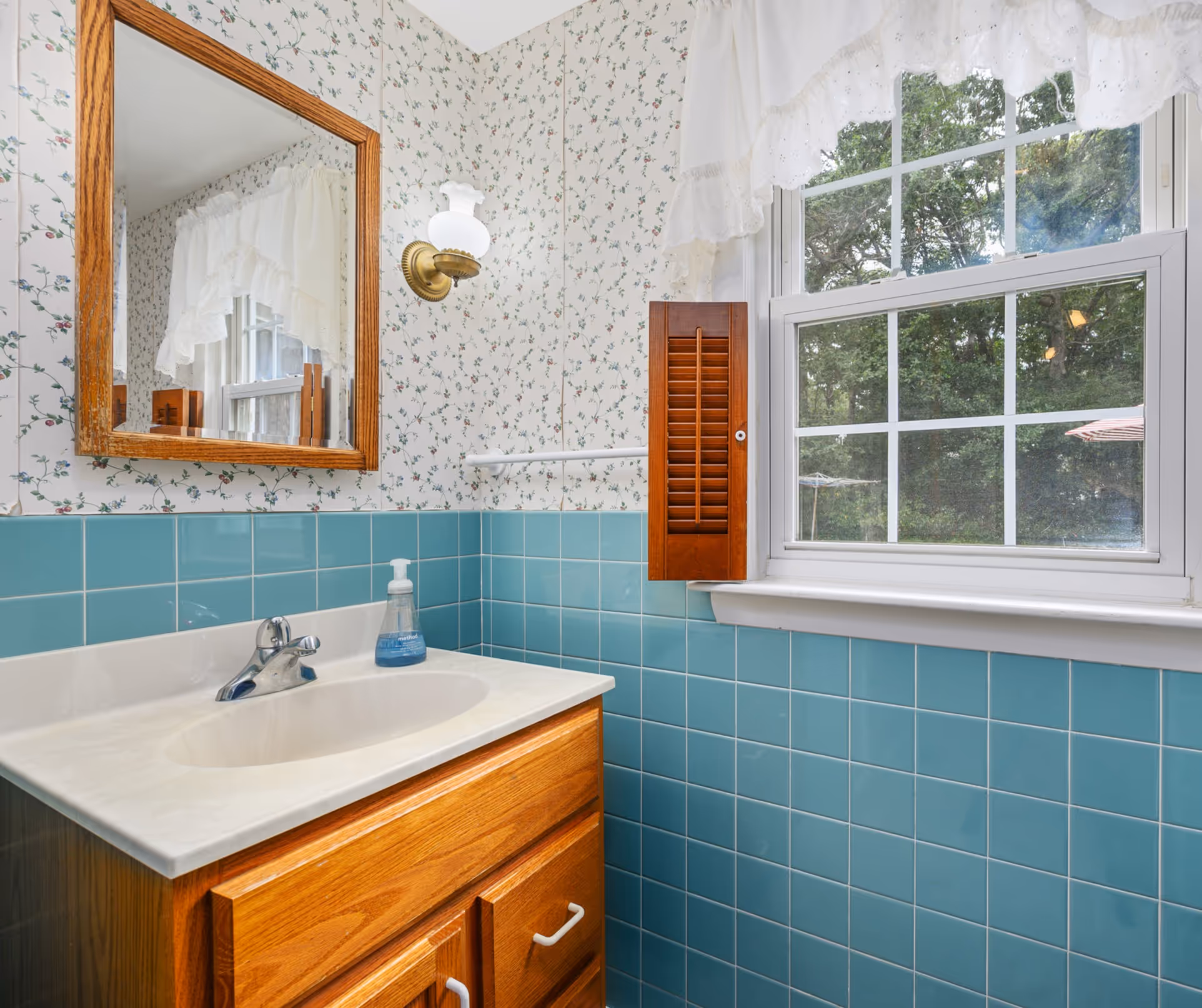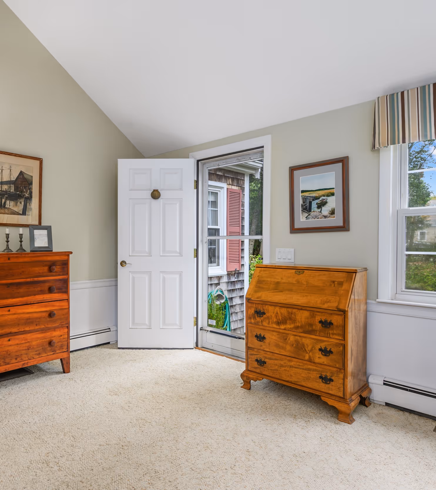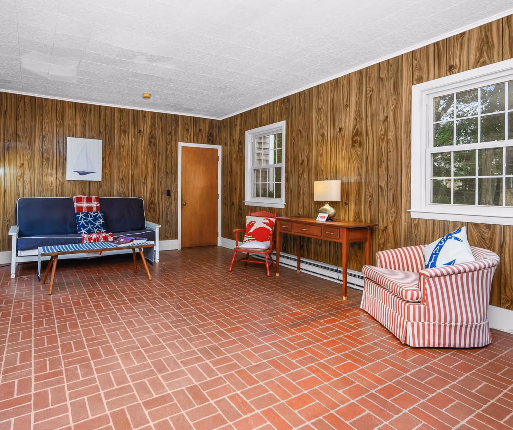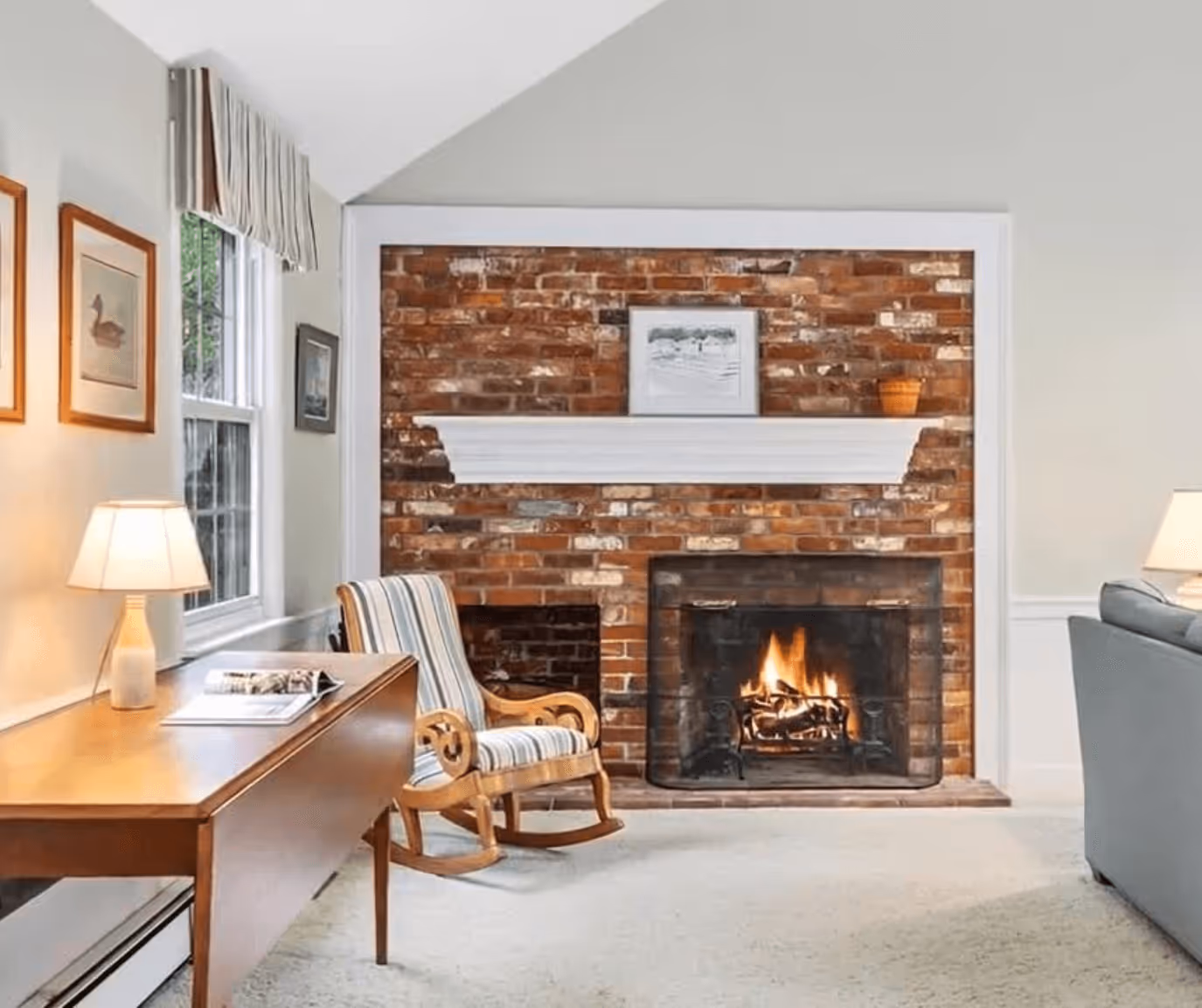 The living room is anchored by a classic brick fireplace and opens beneath a cathedral ceiling with exposed beams and skylights, creating a warm, expansive central space. Light pours in throughout the day, giving the room a bright, natural energy, while the fireplace becomes a cozy focal point in the evenings. Whether it’s coffee in the morning or quiet time after a beach day, this is the kind of room that defines Cape living—timeless, relaxed, and full of character.